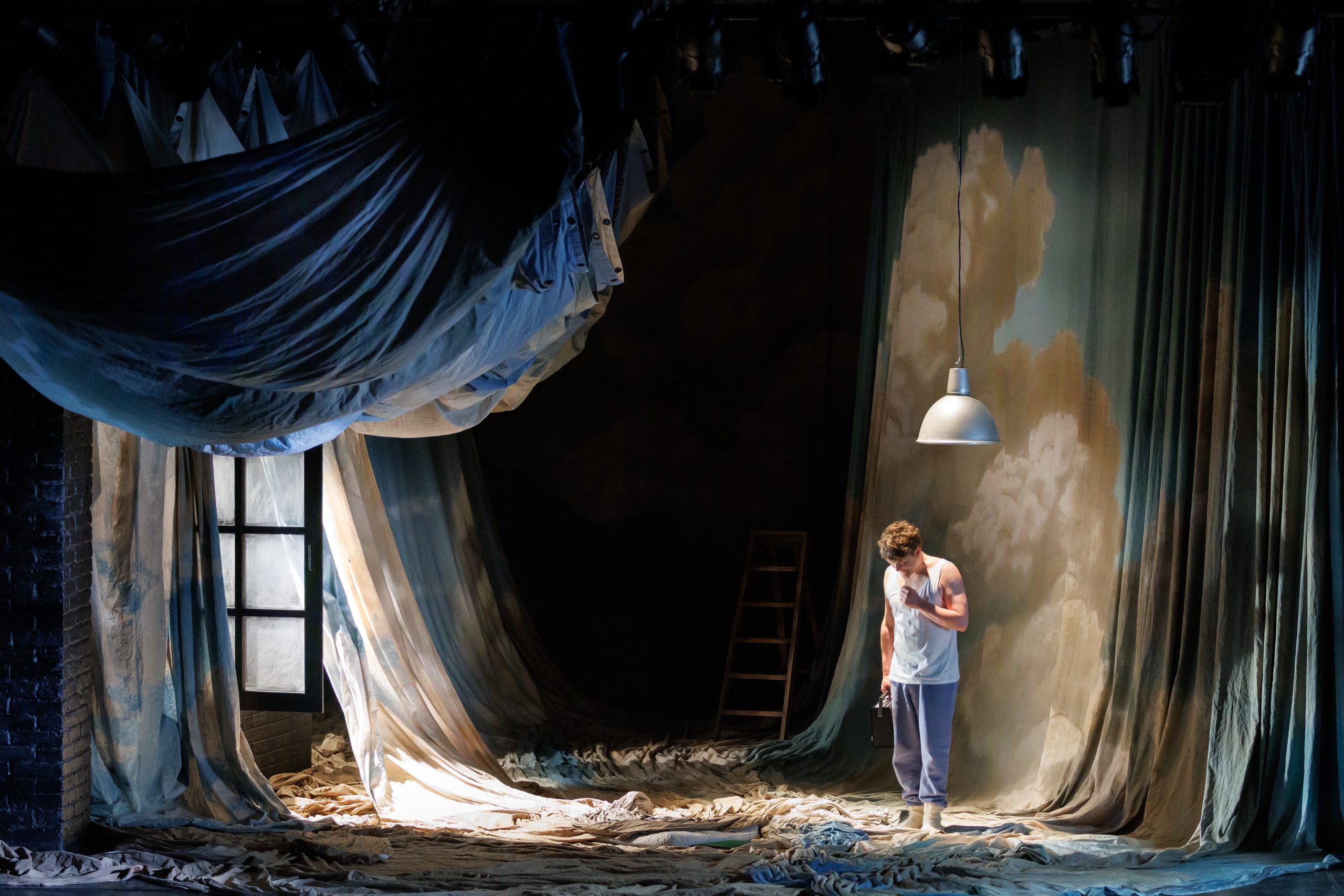 Реальность перемежается воспоминаниями. То ли реальная жена (Татьяна Волкова) зовёт праздновать, то ли это вновь воспоминания о детстве. Герой витает в облаках. Причем в прямом смысле этого слова — сцена вся увешана облаками, нарисованными прямо на простынях (то ли это облака в его воображении, то ли развешенное белье в коммуналке). Художник спектакля — Филипп Шейн.