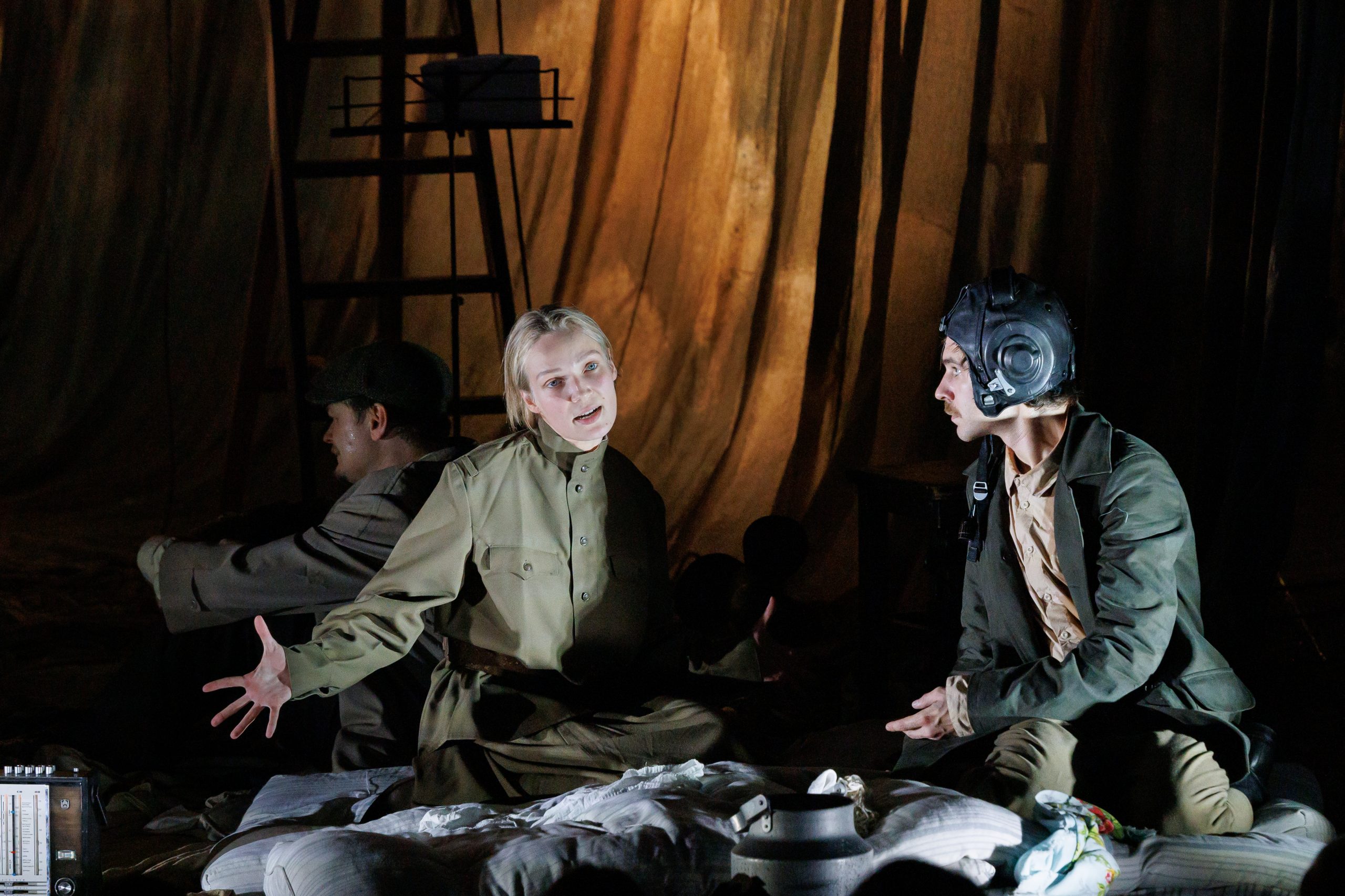 Поэтому на сцену периодически выходят то его сослуживцы армейских времён (прощание с ними — саркастично-грустная отсылка к прощанию из «Трех сестер», только вот кого-то из них, видимо, уже нет в живых), то семья, когда он был еще совсем ребенком (со всем знакомыми репликами: «А покушал ли ты?» — и даже в этих несколько раздражающих репликах есть интонация тепла), то погибшая на войне первая любовь. Воспоминания о днях рождения чередуются с воспоминаниями о встрече Нового года (тут уже даже не так важно, что празднуем, любой праздник — время, когда остро ощущается одиночество).