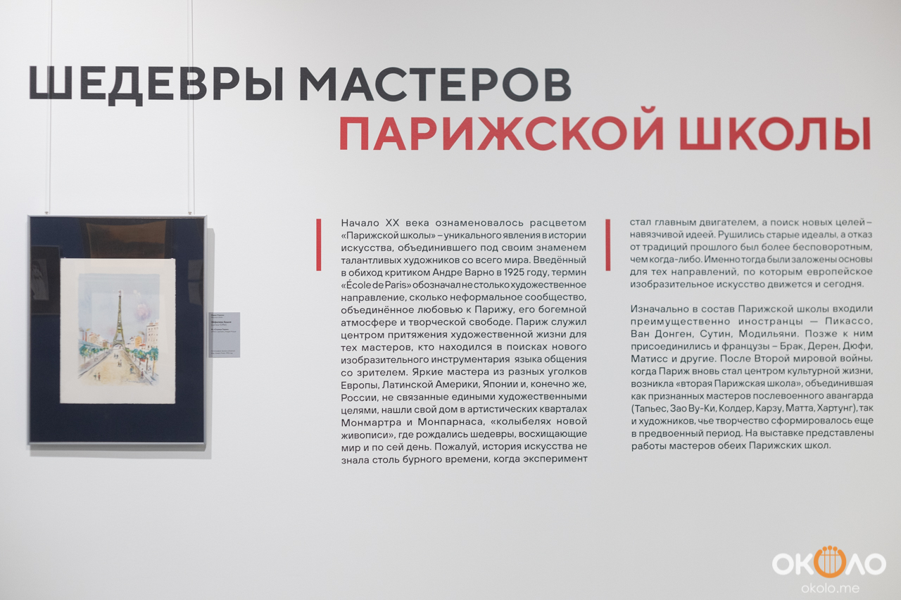 В экспозиции «Шедевры мастеров Парижской школы» представлено более 100 оригинальных работ, включающих графику и скульптуру, созданных более чем тридцатью ярчайшими представителями Парижской школы. Введённый в обиход критиком Андре Варно в 1925 году, термин «École de Paris» обозначал не столько художественное направление, сколько неформальное сообщество, объединённое любовью к Парижу, его богемной атмосфере и творческой свободе. Париж служил центром притяжения художественной жизни для тех мастеров, кто находился в поисках нового изобразительного инструментария, языка общения со зрителем. Значительная часть работ впервые экспонируется в Санкт-Петербурге.