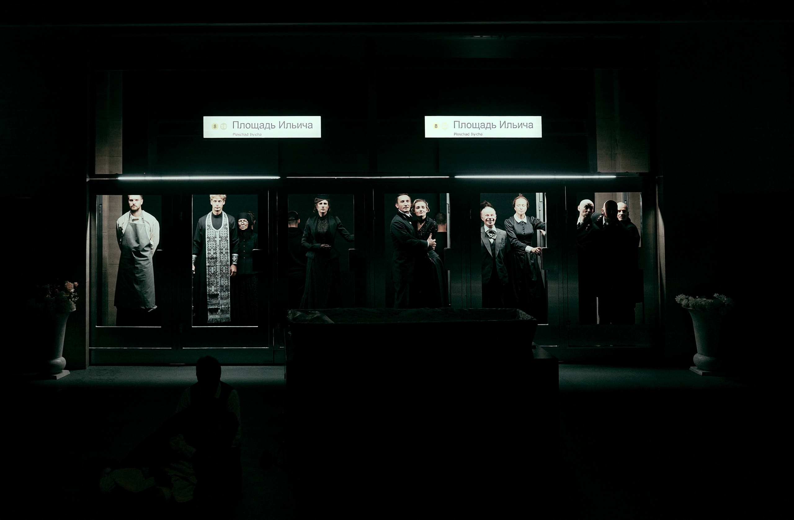 На сцене как будто начинают существовать две временные плоскости: и прощание, и последние дни перед смертью — все одновременно. Поэтому то семья стоит у гроба и плачет (пока Иван Ильич нам, зрителям, рассказывает о том, что с ним происходит от осознания скорой смерти), то гроб вдруг становится частью департамента, в котором работал Иван Ильич (прямо на крышке гроба чиновники перебирают бумажки). И никто не замечает, казалось бы, этого абсурда.