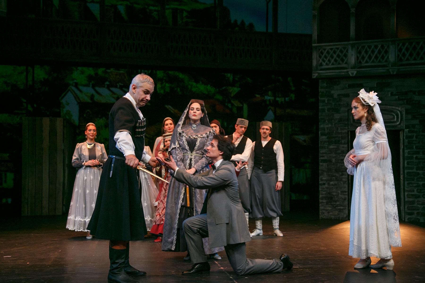 В спектакле много национальных песен и групповых танцев, передающих смысловую нагрузку и оказывающих терапевтическое воздействие на зрителей. Одна из самых захватывающих сцен – холостяцкое застолье князя Вано Пантиашвили в кругу друзей, когда каждый участник говорит свой тост и пожелания жениху. Кавказский тост вначале похож на анекдот, потом следует пожелание, а заканчивается все хоровым многоголосным пением.