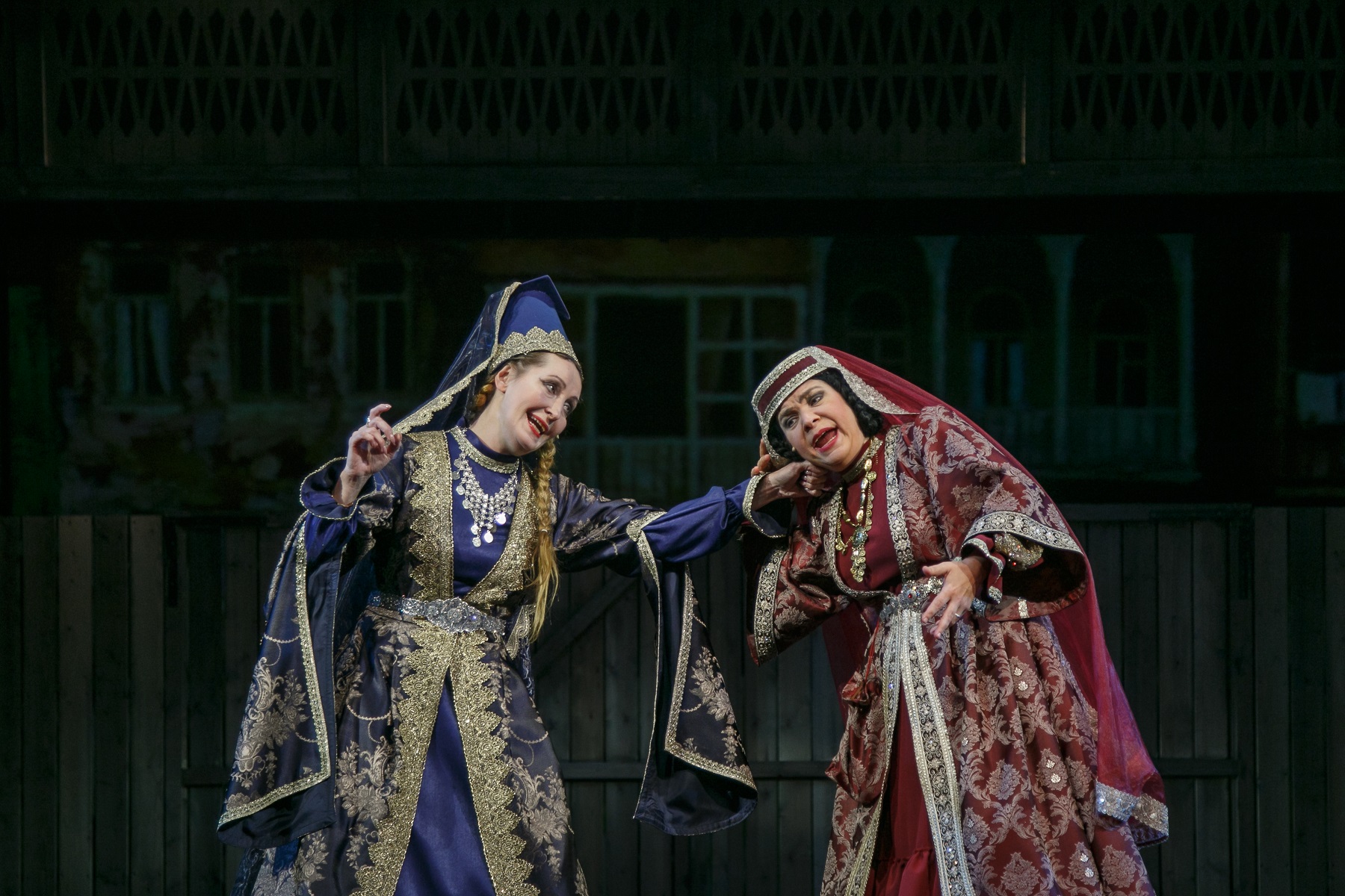 «Гогия, Гогия, Шантаурия Гогия! Гоги, Гоги, генацвале, Шантаурия Гогия!». Кавказская свадьба – событие городского уровня, ни одна большая свадьба не обходилась без свахи – самой уважаемой женщины в городе, от ее умения зависели жизни и судьбы людей. Вячеслав Окунев использовал для создания декораций картины грузинского художника Нико Пиросмани.