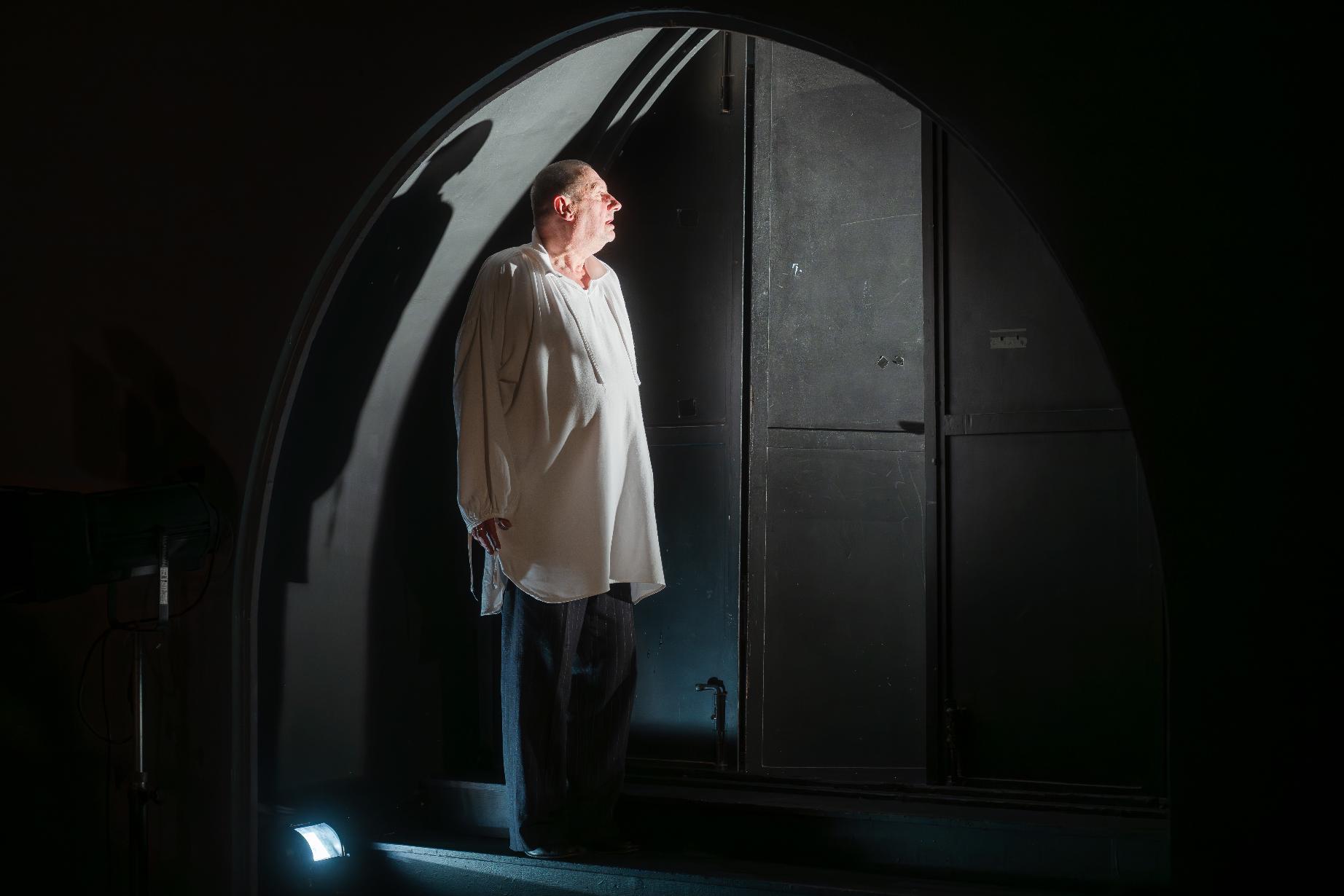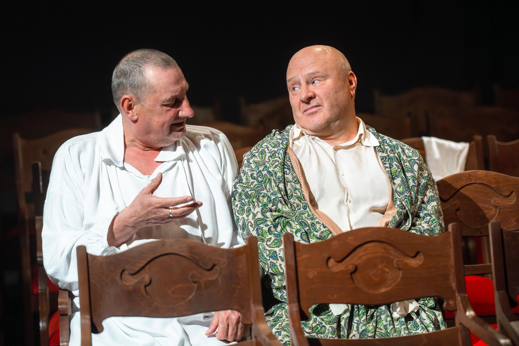 Зрители попадают в камерное пространство 7-го яруса, где на сцене стоят закрытые чехлами зрительские кресла — почти столько же, сколько мест в зале. Действие переносится в дом престарелых актёров, расположенный в заброшенном барском особняке. Режиссёр оставляет здесь лишь трёх обитателей: комедианта и оперного певца Лидина-Байдарова (Сергей Мардарь), знаменитого трагика Славянова-Райского и старого суфлёра Степановича-Стаканыча (Евгений Капитонов).