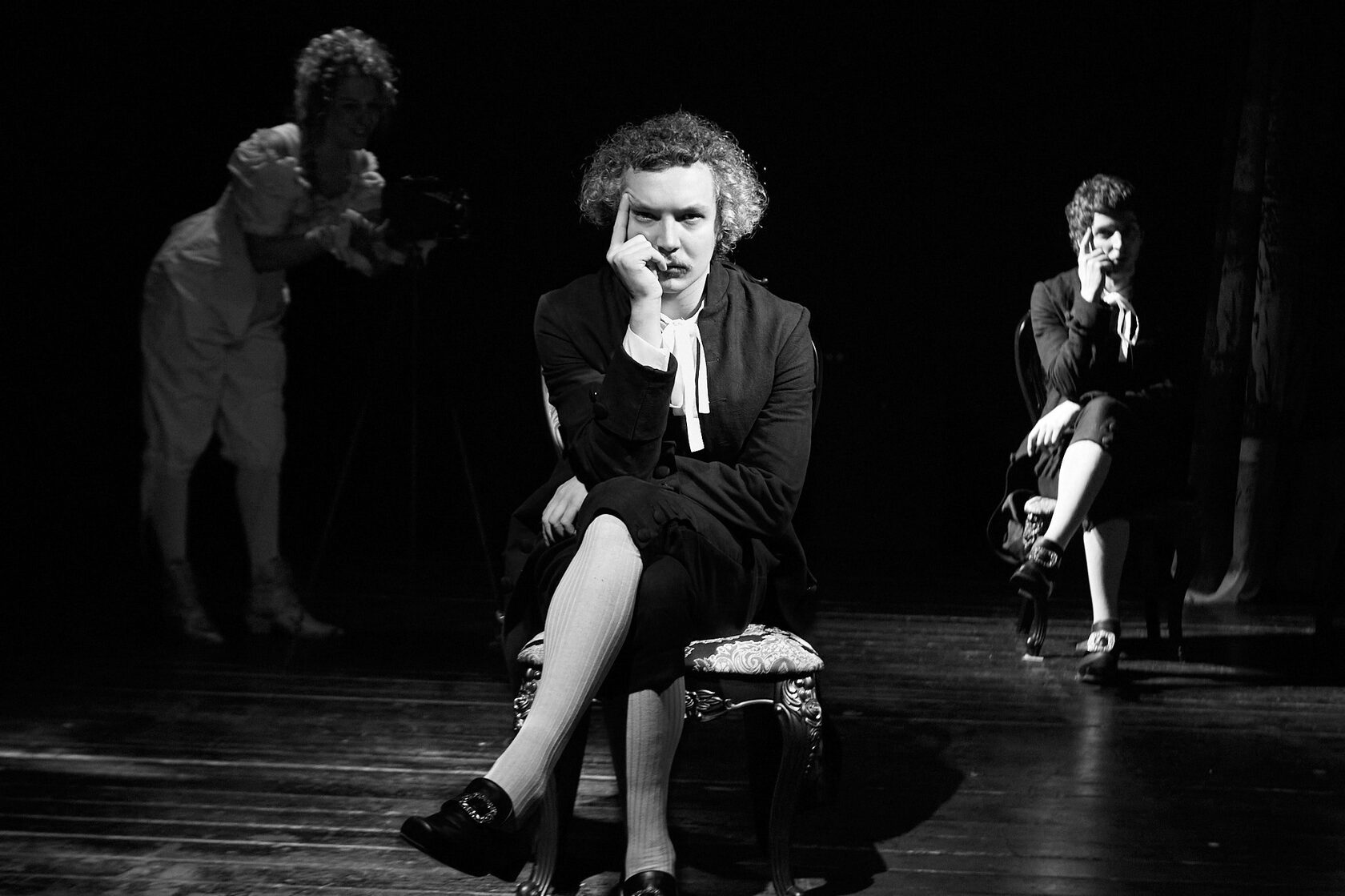 А получилось «Сентиментальное путешествие в прошлое», как говорится в первом титре спектакля. А вернее, — ироничное путешествие, всё построенное на игре в ретро. Тут вам и костюмы, якобы из той эпохи, и слегка театрализованные интонации, подчеркивающие наивность эмоций, описанных Стерном. Сменил парик, сменил немного жесты, сменил немного голос — вот вам и другой персонаж (их играют всего три актера — если оценивать преображение и его скорость, то это очень профессиональные работы). Но так как это все-таки игра в ту эпоху, то и от костюмов иногда остаются лишь главные атрибуты — например, корсет из-под юбки есть, а юбки самой нет. Но для обозначения уже достаточно. А в каких-то образах, наоборот, — детальность — основной костюм может остаться прежним, а «исторические» туфли с пряжками каждый раз меняются.