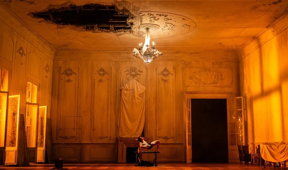 Декорация тоже одна: действие происходит в парадном неоклассическом зале с лепниной и… дыркой в потолке. Петербуржцам такой вид сразу напоминает «Холопов» Могучего, но других сходств я не нашла. Просто ощущение «подернутого обветшанием особняка» сейчас, наверное, общее для всех.