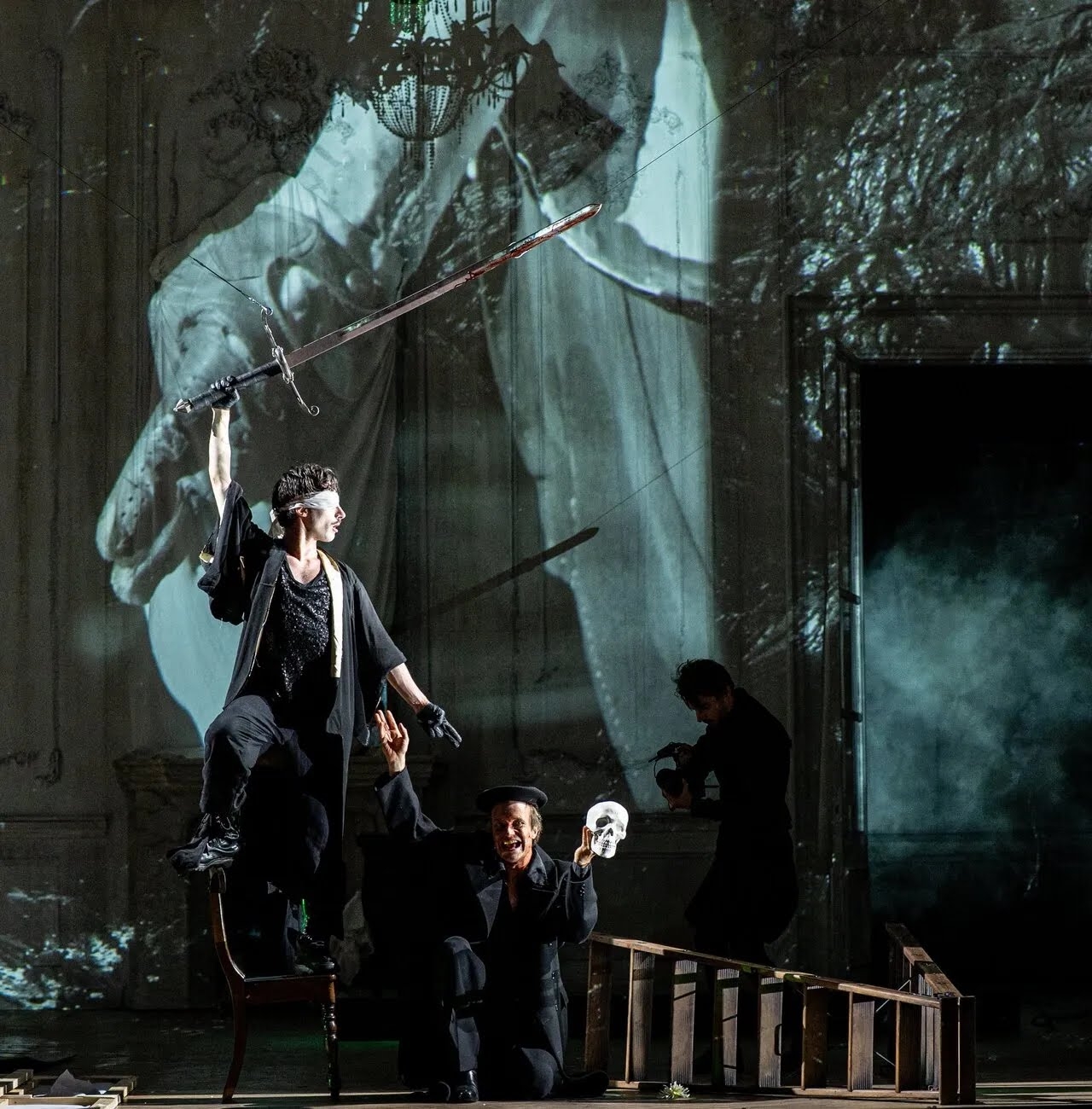 «Гамлет и Страх» – про Дмитрия Шостаковича в период репрессий, когда он каждую ночь с собранным чемоданчиком ждал стука в дверь. Российскому зрителю эта история знакома хорошо, и можно оценить, как выразительно она подана через вещь, через список вещей в чемоданчике (драматург Анна Шалашова). Шостакович в исполнении Филиппа Авдеева – тоже Гамлет, и вот уже Мейерхольд нависает над ним тенью отца. Этот Гамлет не сгорает в действии или бездействии, а долго тлеет между «быть или не быть», но в каждой минуте такого тления есть сила. Страх не победил и не отступил, и в параллель к нему звучит Вторая соната для фортепиано 1943 года (играет Даниил Орлов). В «Гамлет и Жестокость» гротеска добавляет сам Антонен Арто (вновь Август Диль), а следующий после антракта «Гамлет и Призрак» – сугубо пластический (и романтический) эпизод Кристиана Менсы (хореограф Константин Коваль). «Гамлет и Королева» – бенефис Сары Бернар (Жюдит Шемла), которая, как известно, тоже перевоплощалась в Принца Датского. Здесь Жюдит-Сара сразу и Гамлет, и Гертруда – смотря какой стороной повернется. Букет белых лилий для Сары до сих пор можно встретить не только на сцене, но и на ее надгробии на Пер-Лашез.