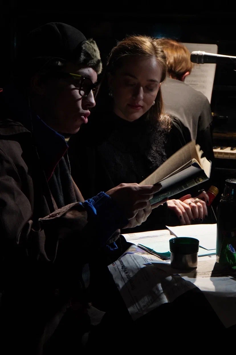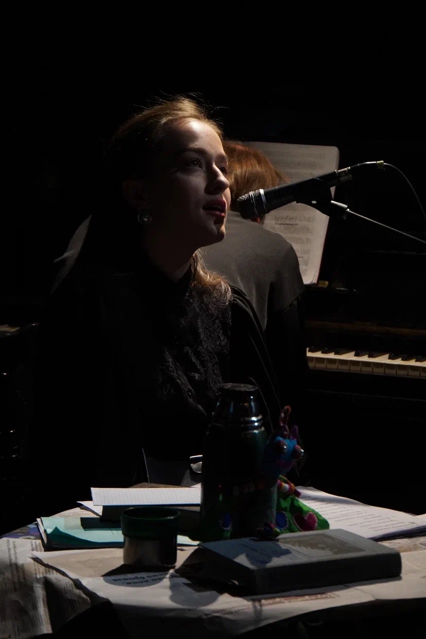 Круг авторов открыл, хотя и не русский, а австрийский Моцарт: фантазия ре минор (фортепиано – Владислав Федоров) – выбор необычный (лирическо-страдальческий настрой понятен, но не ментально неустойчивый же…), однако в контексте вступительной речи, отрывков романа, прозвучавших из динамиков перед концертом, и болезненно-притягательного образа Мышкина прозвучал убедительно, отдавая душевными недугами и эмоциональными перепадами (резкие динамические контрасты, порой чересчур гиперболизированные исполнителем, тому явная причина). К слову, обстановка заведения, посторонние шумы, например, заразительный смех, доносящийся из другого зала, лавирующие между столиками официантки создавали элегантную атмосферу салона, в котором мог оказаться и сам Мышкин. Откровенной неожиданностью стала раздавшаяся после музыки в зале нецензурная брань (а надо знать, куда идете!) и появившийся следом ее источник – главный герой романа (актер, чтец – Алексей Кормилкин). “Лук” неожиданный, советский с шапкой-ушанкой, пальто, разноцветным шарфом, а в руках – термос и кукла, которой актер адресует крайне эмоциональный экзистенциальный монолог (посылает куда подальше, не стесняясь в выражениях, и рассуждает о “бесконечно-вечном”). Что эта кукла пережила: и ругань, и бесчисленные перекладывания с одного места на другое на столе, за которым сидел так называемый “Идиот” – в общем, бесконечные издевательства, от которых ее спасла только в самом конце “Настасья Филипповна” (вокал – Арина Ефименко), унесшая страдалицу с собой.