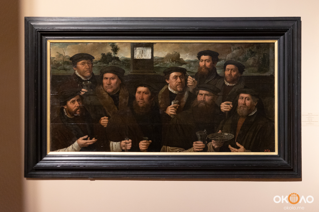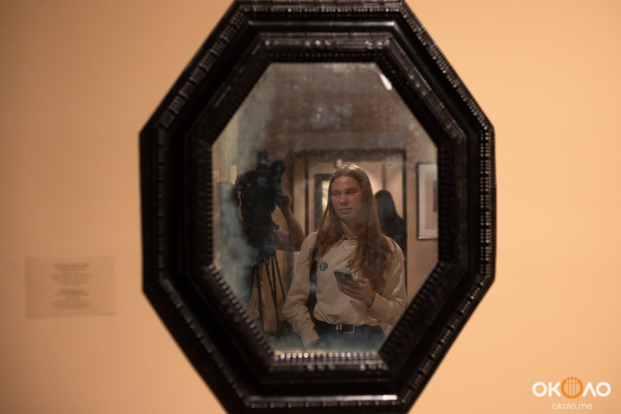В конце выставки вы увидите зеркало. Посмотрите, пожалуйста, в него. Это старинное зеркало XVII века. Его форма и форма рам картин этого времени очень близки, к тому же картины и зеркала вешали примерно на одном уровне.