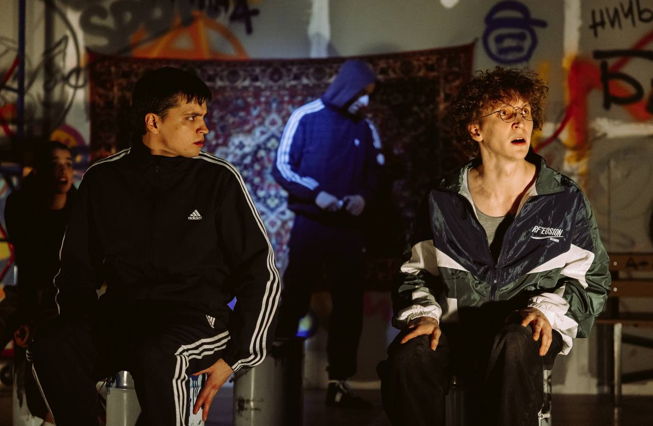 На фоне белых полотен, разрисованных простенькими граффити, герои кажутся бродящими посреди стройки (художник спектакля — Александра Мошура). Сейчас уже уходят в прошлое рисунки на бетонных стенах и металлических пластах, опоясывающих строительные площадки. Но и в спектакле мы окажемся чуть-чуть в прошлом: с одной стороны герои называют близкие нам даты — 2019, 2020, с другой, то, что их окружает, явно выглядит старше/ визуальный ряд совсем не сочетается с реальностью 5-летней давности.