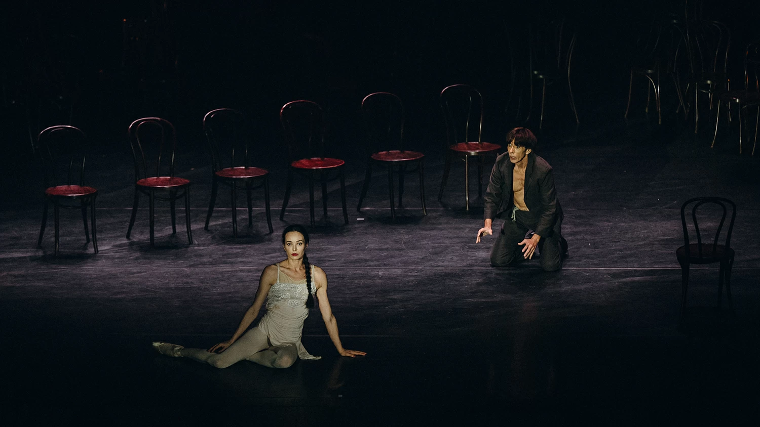 Заманчивой альтернативой «Щелкунчикам» в этом декабре стали предновогодние гала-вечера фестиваля Context Дианы Вишнёвой, прошедшие в БДТ. Главным подарком был, конечно, выход на сцену самой Дианы Викторовны, 22 декабря — в «Тёмной реке» Павла Глухова, 23 и 24 — в «Стульях» Мориса Бежара, вместе с Жилем Романом. Нам посчастливилось побывать на втором вечере.