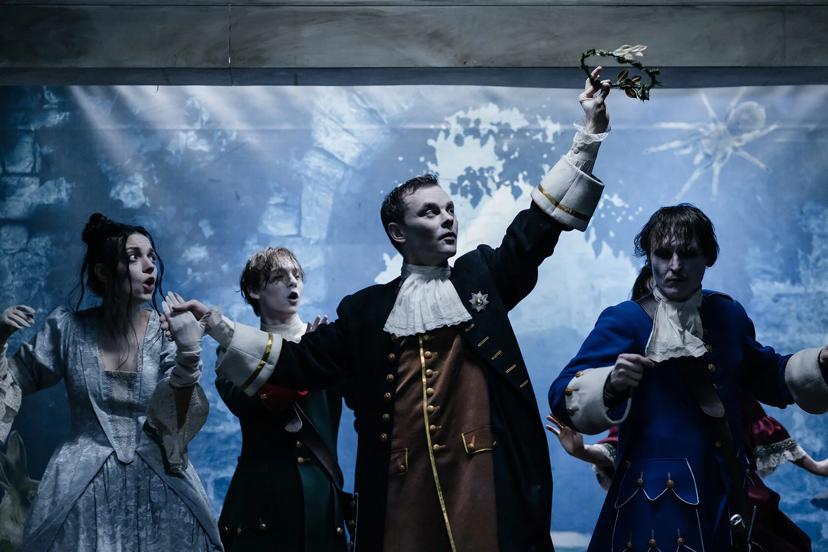 Дальше режиссер словно дает зазор между яркой маской персонажа и реальной психологической игрой. От буффонады первой части остается только внешний рисунок роли: внутри же все рушится. Курфюрст все еще широк в жестах, но становится заметно, как ходят желваки, как непроизвольно сжимаются кулаки. Он приносит в жертву порядку и закону своего любимого воспитанника, ведь на войне нет места самовольным решениям. Именно здесь открывается истинная жестокость побед, звучащих в истории торжественно и высоко.