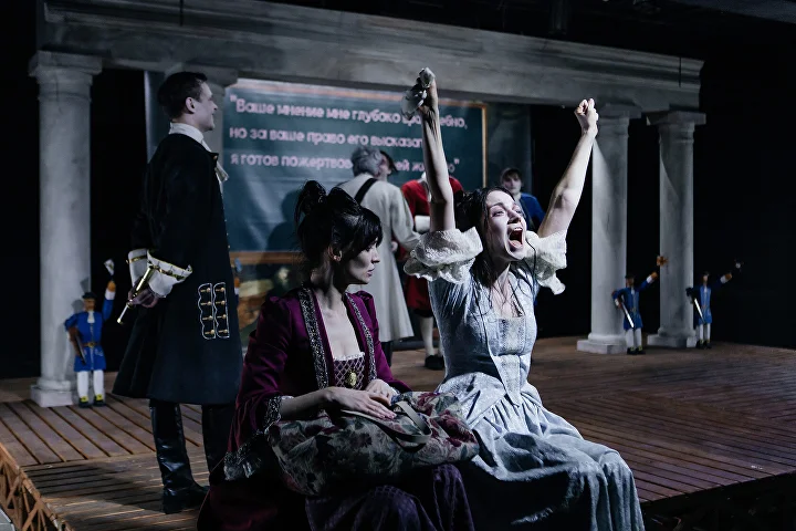 Спектакль устроен довольно хитро. На сцене художник Алексей Лобанов выстроил небольшой камерный театр — деревянный помост, портик с колонной и сменные задники. Такое пространство сразу намекает зрителю, что впереди — игра в театр, и действительно все начинается почти как балаган: с шутками, весельем, почти оперными пропевами текста и гротескными поворотами сюжета.