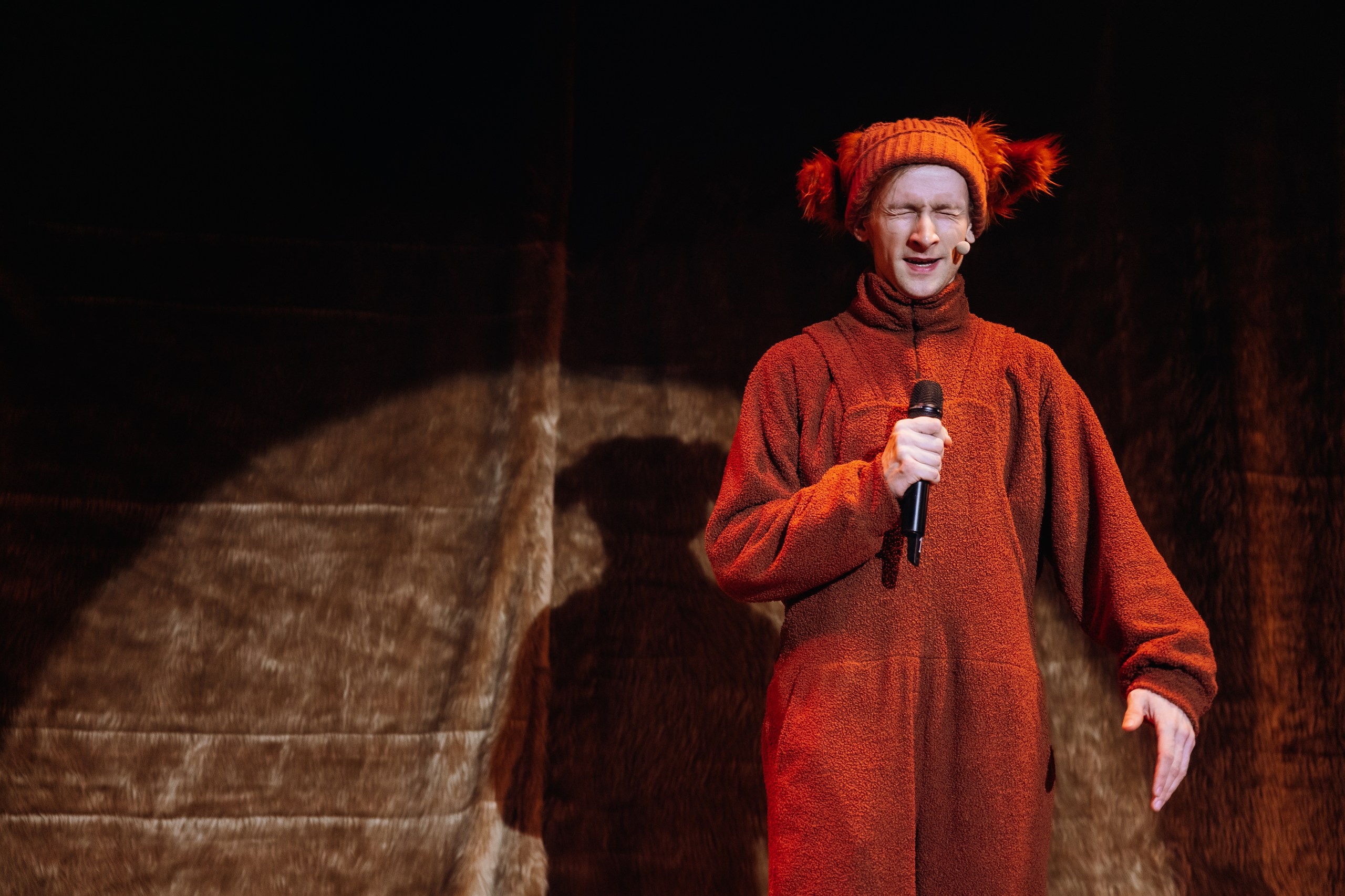 Спектакль Драм.Площадки, как всегда, музыкален и пестрит отсылками. А исполнение нескольких ролей одним актером уже становится фишкой театра. Станислав Шапкин примерил не только роль жизнерадостного пса. Объединяя юмор и трагизм, артист меняет маски: то исполняет роли трех бездомных собак, поющих одну песню, то в одиночку показывает привидевшийся диалог героя с предком всех собак — древним волком — и убеждает его, что тысячи лет эволюции прошли не зря.