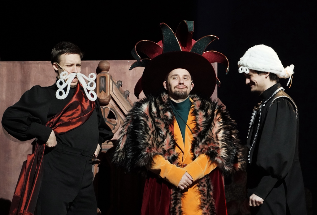 Самым юным зрителям очень нравится кот в сапогах – настоящий квадробер (Анна Полюшко). Восхищают костюмы главных героев, в них театральный гротеск соединяется с историческим средневековым стилем – внушительная корона короля, серебристый колпак мага, рогатые эннены дам.