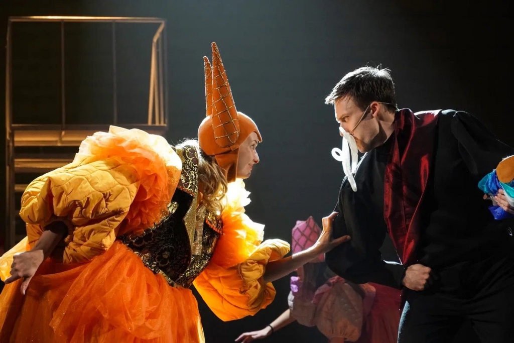 Самым юным зрителям очень нравится кот в сапогах – настоящий квадробер (Анна Полюшко). Восхищают костюмы главных героев, в них театральный гротеск соединяется с историческим средневековым стилем – внушительная корона короля, серебристый колпак мага, рогатые эннены дам.