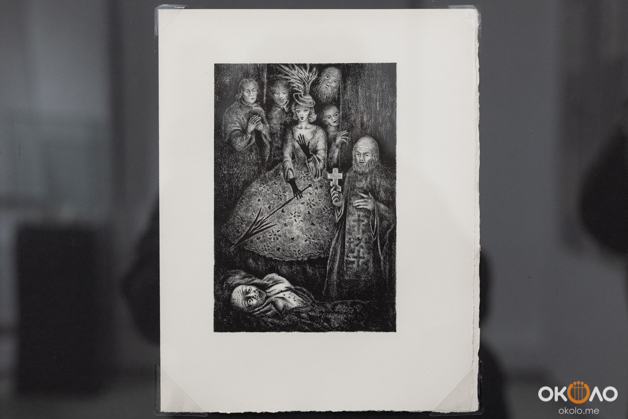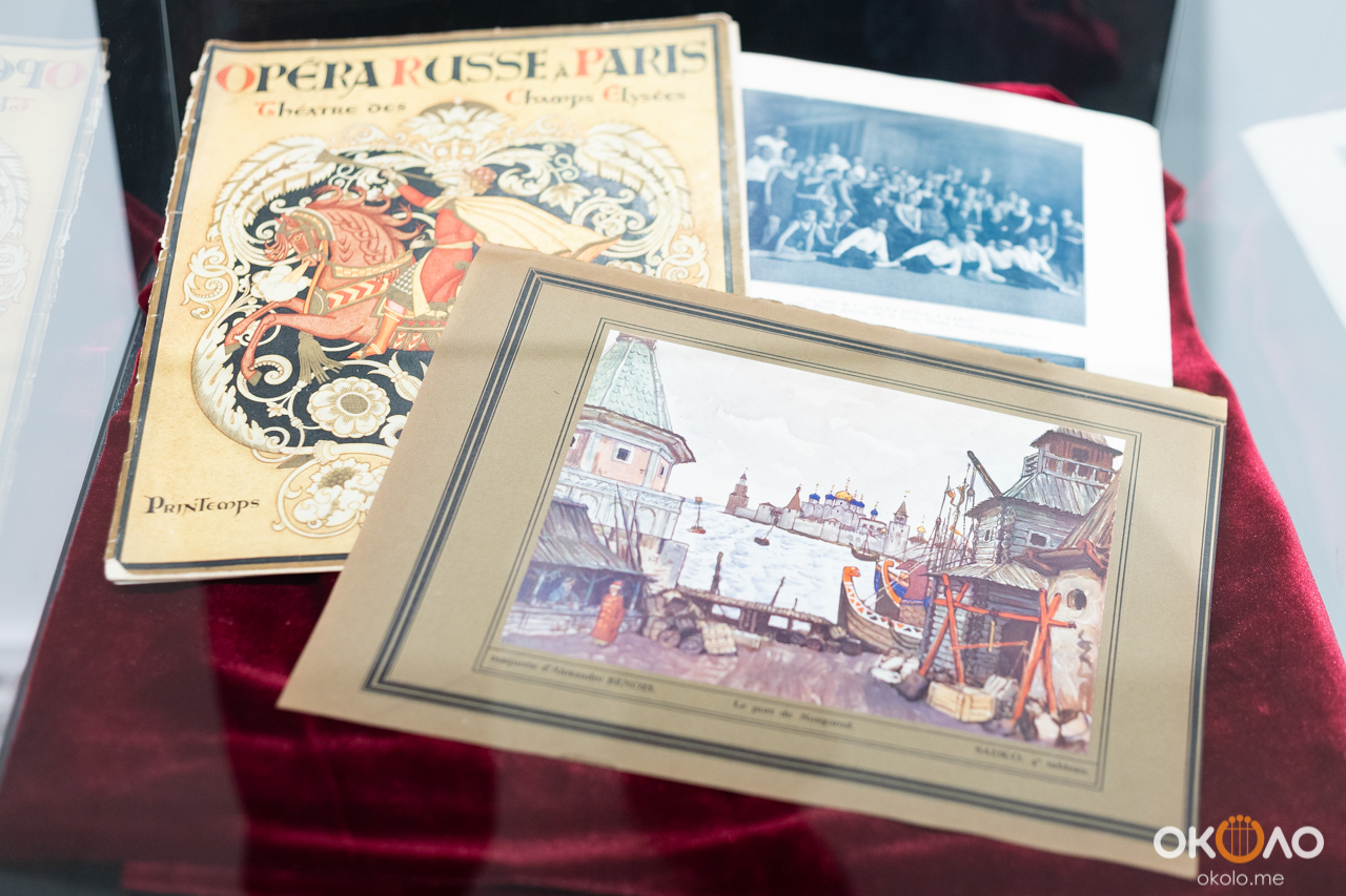 Если продолжать разговор о графике, то это, конечно, раздел русские сказки. Из нового: у Бориса Зворыкина представлено четыре блока иллюстраций к сказкам Пушкина: «Золотой петушок», «Сказка о царе Салтане…», «Сказка о мёртвой царевне» и «Сказка о золотой рыбке». Когда художник эмигрировал во Францию, то он, в основном, занимался оформлением книг — так и появился сборник 1925 года. Сами иллюстрации выполнены в технике хромолитографии, некоторые детали блестят серебром или золотом. Это очень насыщенное по декору издание. На самом деле иллюстраций у нас в коллекции ещё больше, и решить, что именно показать зрителю на этот раз, было довольно сложно, что-то в запасниках оставлять было действительно жаль.
