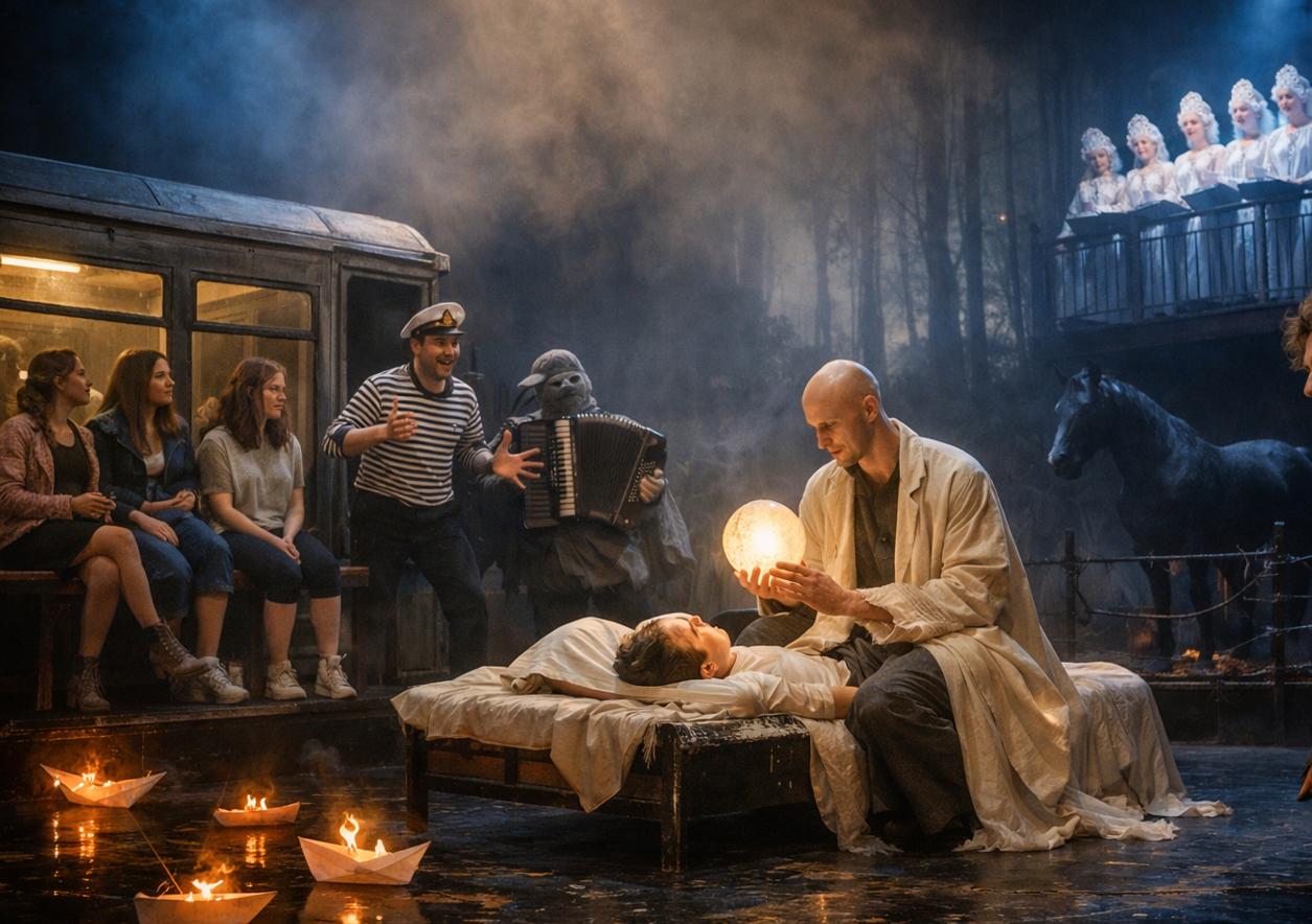 Птицы-вещуньи блистают и поют с верхней ложи на сцене, девицы-лебеди, проводницы в иной мир, водят хоровод вокруг главного героя. На заднике бежит пейзаж за окном электрички. А кто же три девицы под окном? Это три девушки, едущие в электричке и сидящие на деревянной лавке. Они обсуждают философию Марка Фишера, яростно споря о том, что такое «депрессия». Обычные милые студентки, учащиеся в «волшебной школе», школе, где учат видеть подкладку материального мира. За их философскими спорами скрываются личные тяжёлые драмы: сходящий с ума отец, потеря любимого дедушки, одиночество и страшные сны. Но и эти истории режиссёр рассказывает с интонацией притчи: поездка на море превращается в прекрасную сказку, утопление дедушки на зимней рыбалке в непугающее видение, а гибель девушки — в магическое, сновидческое превращение в русалку.