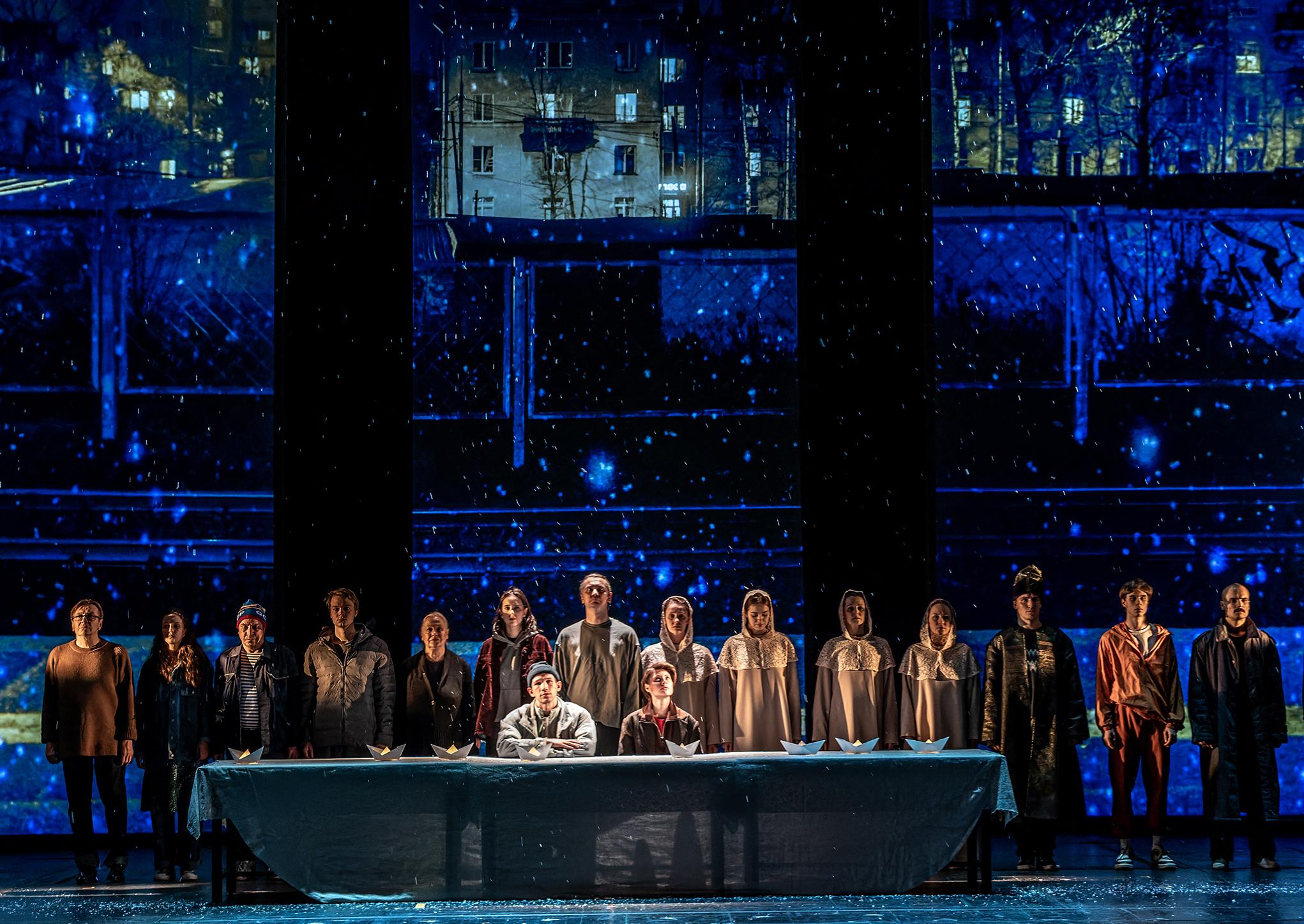 Перед спектаклем на закрытой занавесом сцене зритель видит старое советское кресло и трельяж. В программке дан ключ к этой обстановке: «В пять лет я сильно заболел гриппом. Рядом сидела бабушка и читала мне “Сказку о царе Салтане”». Занавес раздвигается, и на авансцене появляются персонажи, сидящие за длинным столом: девушка и молодой человек (Геннадий Блинов). К ним по одному проходу в партере идут поющие сказочные распевы девицы-птицы, словно сошедшие с картин Васнецова; по другому — девушки в белом, похожие на лебедей. В это же время на сцену выходят остальные жители города. Все вместе — обычные и сказочные — выстраиваются в один ряд. Падает снег, на экранах — бесконечный перрон и рельсы. Путешествие начинается. И в этом путешествии для режиссёра важен именно путь, а не точка отправления или прибытия.