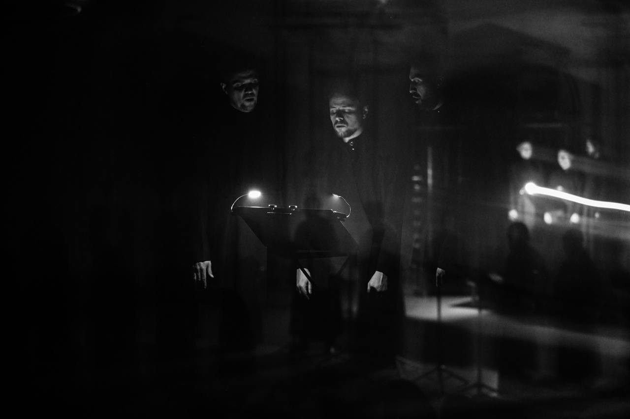 Белые одежды в пол сменились черными похожими на монашеские одеяниями, а Андрея Немзера – Иван Горин. Мужской хор представил более однообразную программу, но также построенную на чередовании солистов и хора (правда, чуть более хаотичном). Попытка пластикой компенсировать некоторую монотонность отделения привела к использованию одних и тех же расположений в пространстве, к его завершению уже можно было предсказать дальнейшие передвижения артистов. После активностей первой половины, вторая выглядела менее впечатляюще. Однако замысел и не требовал выразительных и частых изменений: богослужебная музыка византийской и православной традиций, а также литургические произведения композиторов прошлого и нашего столетия будто изначально предполагает «зацикленность» на одном состоянии. При этом исполнение мужского хора отнюдь не уступало женскому – одухотворенность звучания, эмоциональная отрешенность, переходящая в наполненность – артисты, безусловно, продемонстрировали коллективную слаженность и колоссальную работу.