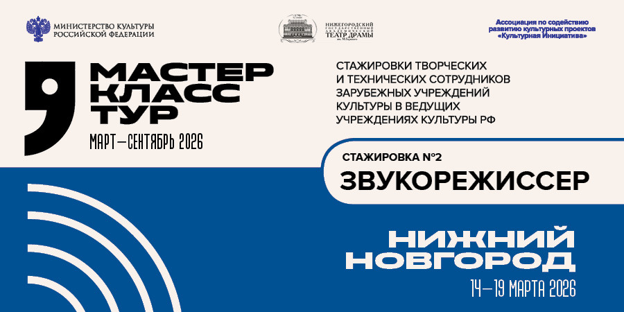 С 14 по 19 марта в Нижегородском государственном академическом театре драмы им. М. Горького проходит стажировка звукорежиссеров, включающая в себя теоретические занятия и участие в выпуске спектакля «Супруга» в постановке Анатолия Праудина. Руководитель стажировки — звукорежиссер Нижегородского государственного академического театра оперы и балеты им. А. С. Пушкина Сергей Банников. С зарубежными коллегами работают сотрудники звукового цеха театра драмы им. М. Горького. Участники посетят Нижегородский государственный академический театр оперы и балета им. А. С. Пушкина, узнают об особенностях работы звукового оборудования в музыкальном театре.
