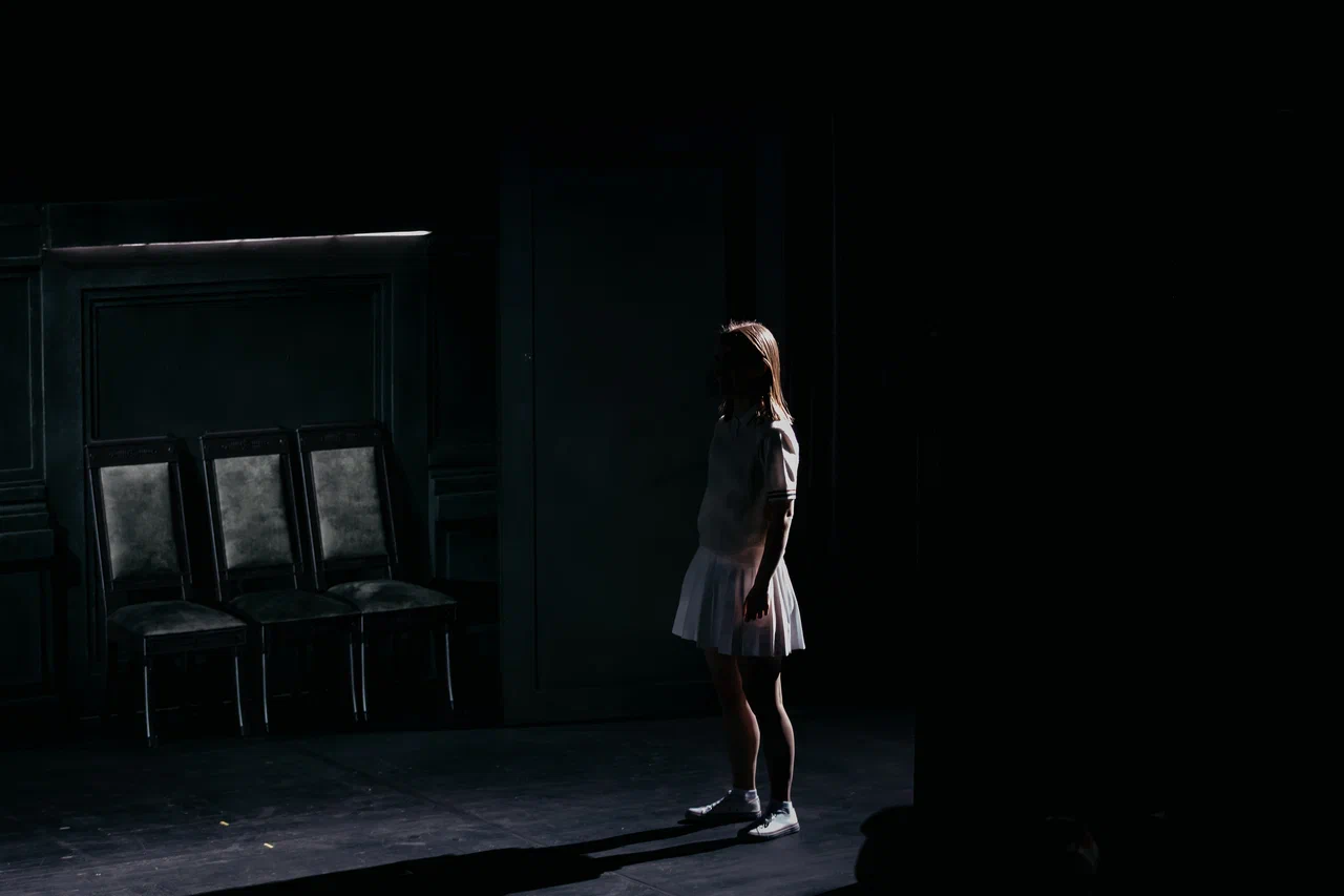 Сценография Ютты Роттэ выстроена на контрасте. Черное, почти готическое пространство с массивными дверями и высоким окном скрывает второй уровень, белый и стерильно освещенный, будто вынесенный из современного интерьера. Этот верхний этаж большую часть времени остается невидимым и используется для проекций сновидений персонажей, снятых в особняке Брусницыных в стилистике хоррора. Сама сцена работает как замкнутая система, где любое движение, слово или жест отзываются напряжением.