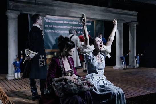 Поставила, ничего не осовременивая, а нарочито подчеркивая «историчность» происходящего. Тут и костюмы вроде как из той эпохи, и романтические картины-задники (то сцены битвы, то пасторальные пейзажи, то сцены светской жизни с элегантными кавалерами — в зависимости от места действия каждой отдельной сцены; единственная «локация», которая не сопровождается такими иллюстрациями, это тюрьма, куда посадили Принца), и помост сцены как в каком-нибудь придворном театре, окруженый колоннами.