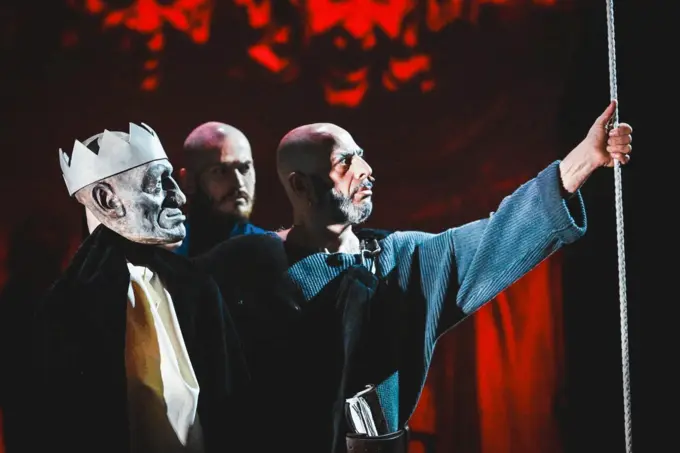 Впрочем, и далее в спектакле шекспировский текст периодически перемежается театральными комментариями. Иногда происходящее на сцене «ставится на паузу» рассуждениями по аудио из теории театра. Иногда шекспировские фразы вызывают околотеатральные шуточки: например, на реплику Кента (Антон Ксенев) «мое ремесло простое — быть, а не казаться» якобы из-за кулис слышится «как у Станиславского».