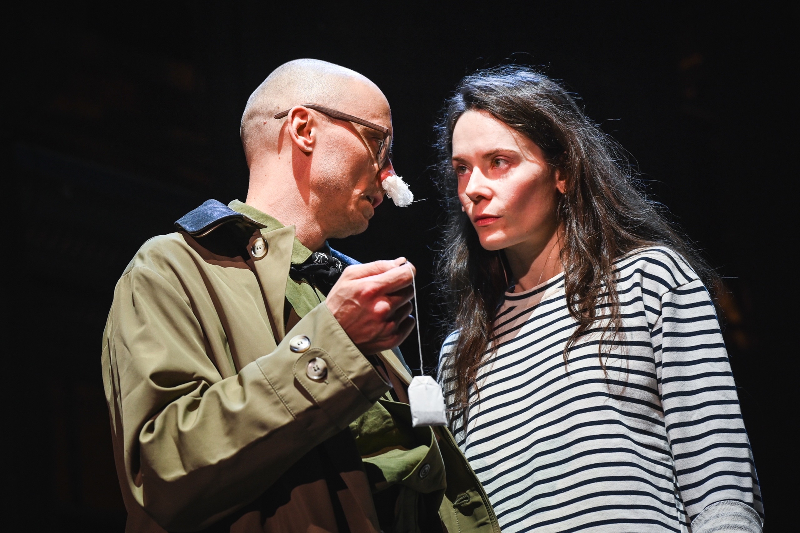 Тут одна из самых важных деталей спектакля — Ольга (Надежда Флерова) в Наташе, когда та очень грубо приказывает выгнать няню (карикатурная старуха — почти что Баба Яга), видит отца. Всё второе действие на сцене стоит огромный мужской портрет с дыркой вместо головы — куда и залазит Наташа. То есть воспоминания сестер о прошлом не такие уж и теплые (хотя в другой сцене, после возгласов «в Москву, в Москву», мы видим идиллическую детскую видеохронику) — видимо, отец у Ольги ассоциируется с властным насильственным порядком (по-настоящему военным, а не карикатурно военным, как у всех других мужчин в этом доме).