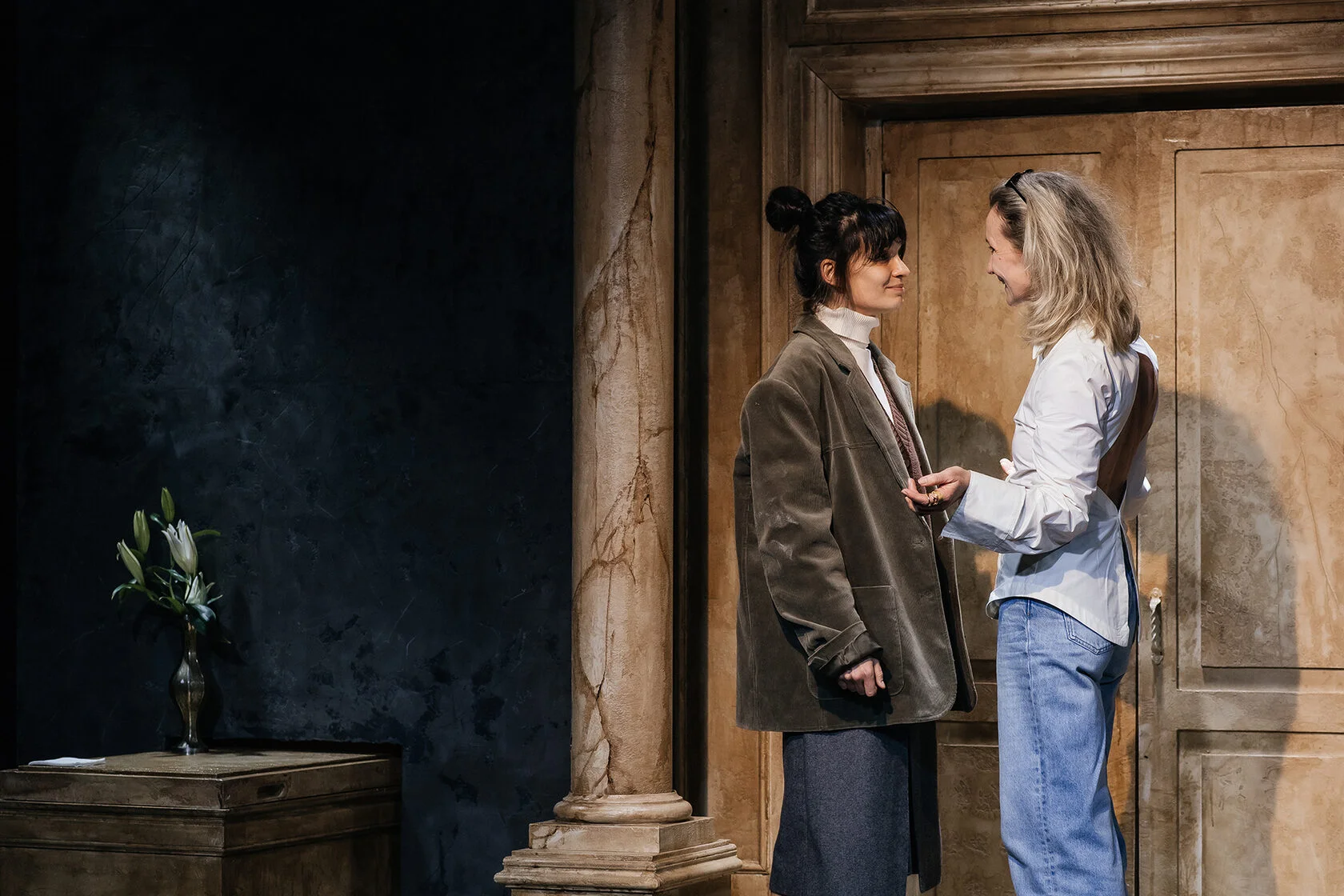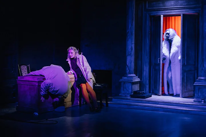 Лейтмотив спектакля — «Лунная соната» Бетховена. Хотя иногда в это сумрачное пространство врезаются и попсовые шлягеры — например, песня «Ева» (даже имя совпало): «Ева, я любила тебя // Зачем остановила меня?». В этом есть, конечно, доля стеба, но он только больше подчеркивает общий уровень отчаяния и боли. Когда смех переходит в истерику. Как и от несколько раз повторяемого тоста (муж его произносит раз пять — сначала становится смешно, а потом уже не очень): «Жить тебе у нас хорошо и долго». Как-то в этом склепе хорошо вряд ли можно, а долго не хочется…