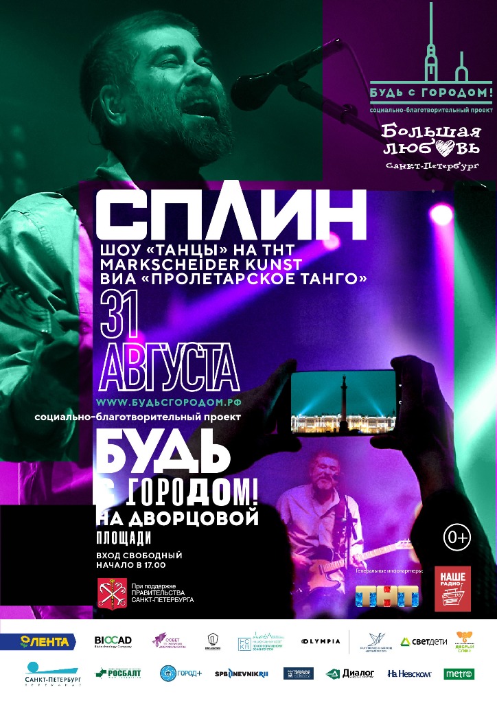 31 августа на Дворцовой площади состоится общегородской социально-благотворительный проект «Будь с Городом!». В программе – выставка-презентация благотворительных фондов и волонтерских организаций, мастер-классы, интерактивные развлечения и концерт. В этот день на Дворцовой площади пройдет петербургская премьера масштабного шоу «ТАНЦЫ» от ТНТ, выступят группы «Маркшейдер Кунст», «Пролетарское Танго». Хедлайнером станет группа «СПЛИН». «Будь с Городом!» - это и праздник, и масштабная социальная акция, направленная на развитие благотворительных инициатив.…
