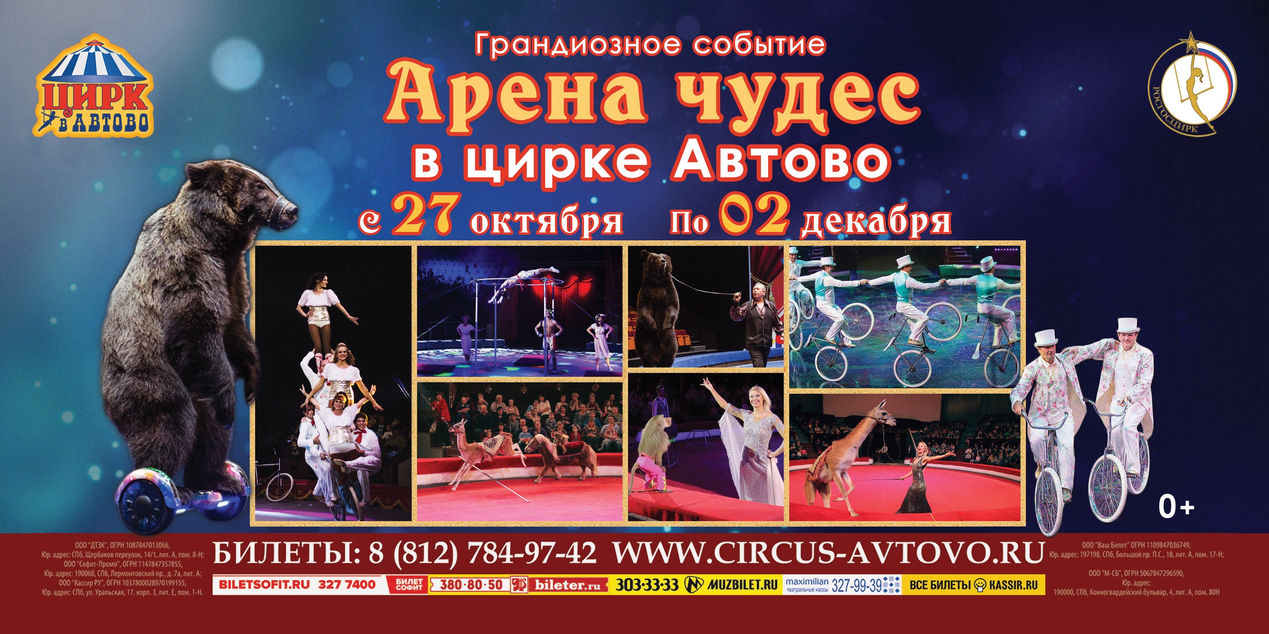 Цирк в Автово с огромной радостью приглашает Вас на новую, непревзойденную программу «Арена Чудес»! С 27 октября. Впервые на манеже цирка, в разгар осенних детских каникул – Аттракцион «Косолапые звезды манежа», под руководством Олега Алексеевича Красова, выдающегося дрессировщика и дипломанта международных конкурсов. Удивительные БУРЫЕ МИШКИ продемонстрируют чудеса дрессуры, свободно катаясь на гироскутере, выполняя сложные акробатические трюки. Номер, который принес артисту заслуженную награду от жюри и зрителей, приведет…