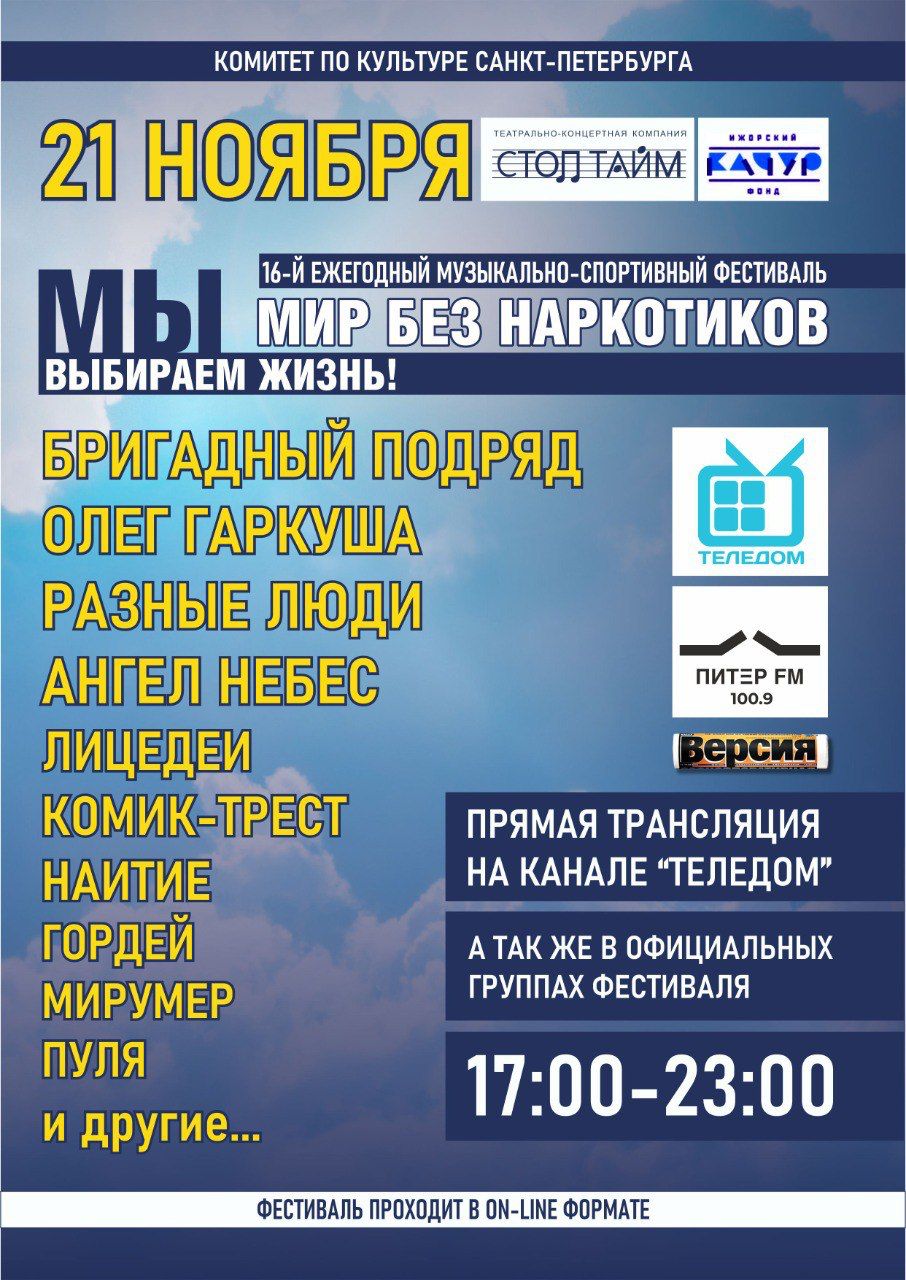 21 ноября состоится 16 –й ежегодный фестиваль «Мир без наркотиков». Фестиваль пройдет в формате онлайн и начнется в 17:00 в прямом эфире телеканала «Теледом» и на vk.com/rockfestival_spb В фестивале примут участие рок-группы: «Бригадный…