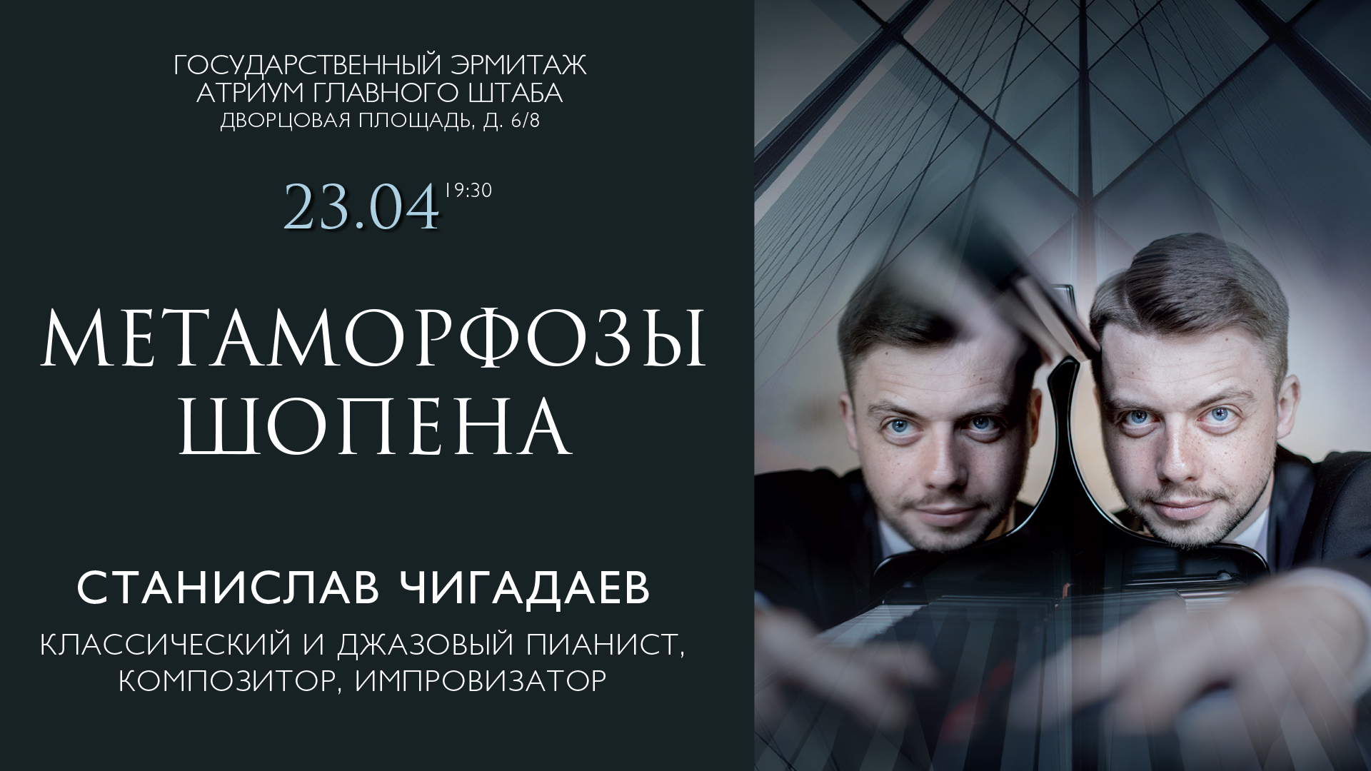 23 апреля классический и джазовый пианист, композитор и аранжировщик Станислав Чигадаев выступит в Атриуме Главного штаба Эрмитажа с программой «Метаморфозы Шопена». В первом отделении в исполнении музыканта прозвучит Шопен классический, а во втором…