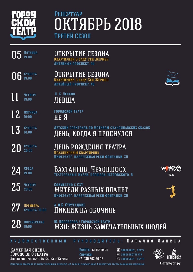 5 и 6 октября Санкт-Петербургский Городской театр открыл третий театральный сезон премьерой квартирника «Времена не выбирают» и презентовал программу на сезон. В 2016 году, когда недавние выпускники Театральной академии на Моховой решили открыть…