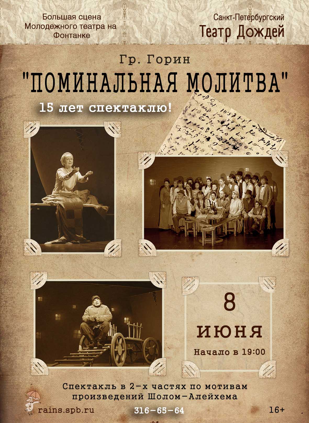 ПодробнееСанкт-Петербургский Театр Дождей на Большой сцене Молодежного театра на Фонтанке 8 июня 2018 года последний раз в сезоне представит свою версию знаменитого произведения Григория Горина "Поминальная молитва". Постановка Натальи Никитиной в этом году…