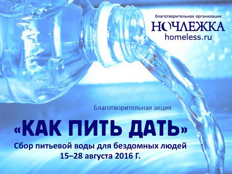 С 15 по 28 августа «Ночлежка» проводит акцию «Как пить дать»: организация собирает питьевую воду для нуждающихся людей. Предпочтительнее негазированная вода в бутылках емкостью 0,5-0,6 л. Это более удобная тара для раздачи, к…