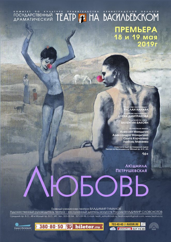 Премьера в Театре на Васильевском! 18 и 19 мая 2019 г. будет показан спектакль ЛЮБОВЬ (16+) по пьесе Людмилы Петрушевской. «Вот и встретились два одиночества» - эта строчка из известной песни может стать лейтмотивом будущего…