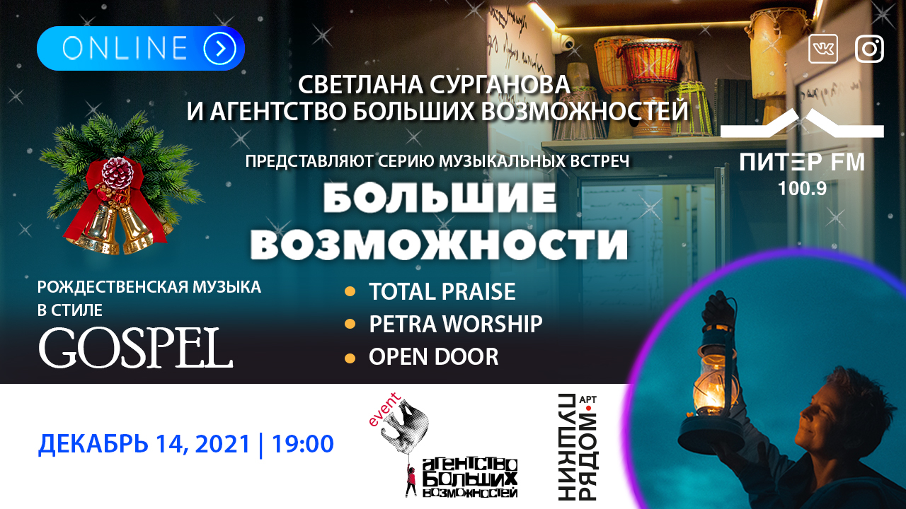 ПодробнееСветлана Сурганова совместно со своим давним партнером — Агентством Больших Возможностей — при поддержке радио «Питер FM» продолжает серию творческих вечеров в арт-пространстве «Пушкин Рядом» и представляет концерт, наполненный рождественской музыкой в стиле госпел! 14…